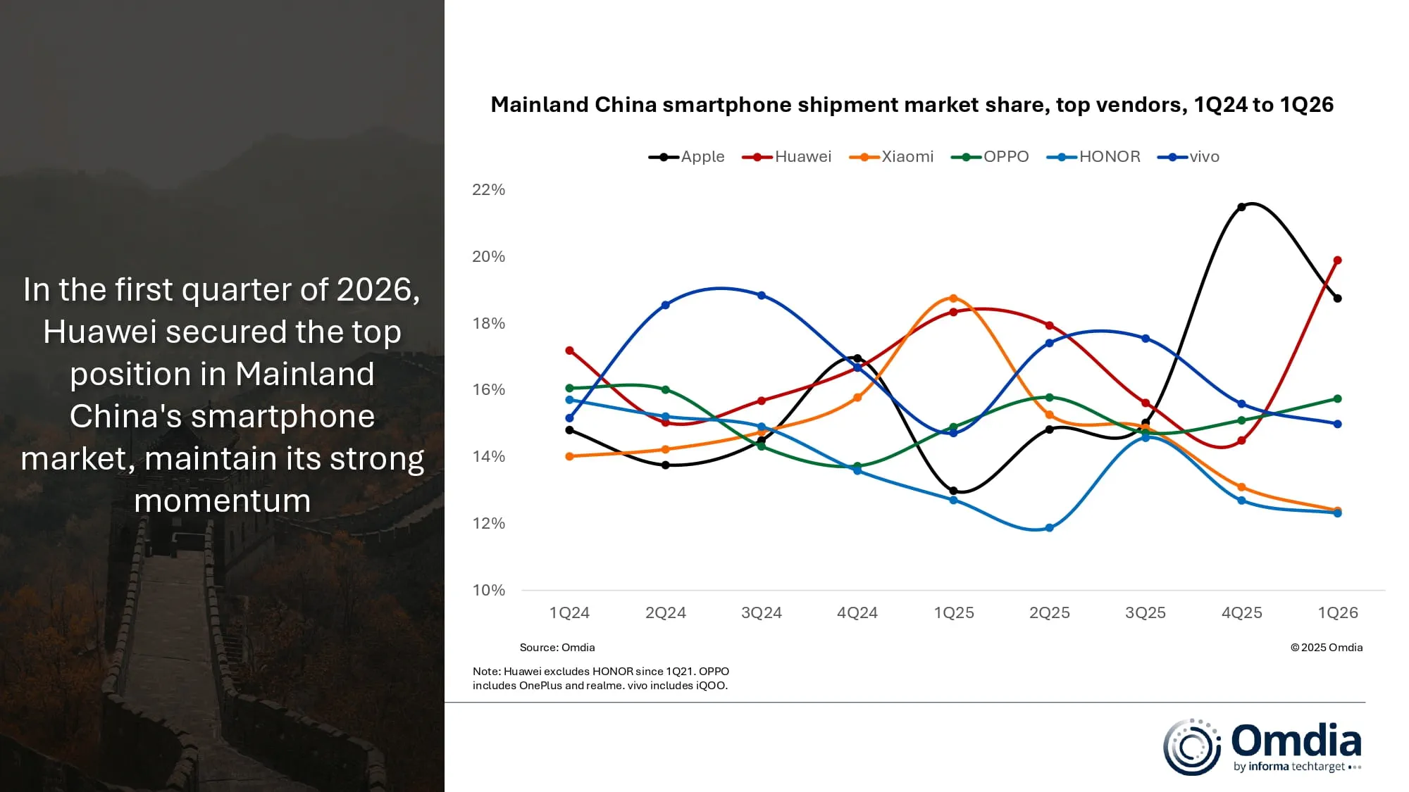 “To balance volume, revenue, and profitability against rising memory prices, several major vendors, including Xiaomi, HONOR, OPPO, and vivo, raised retail prices on select models by 10–30% in the first quarter,” said Hayden Hou, Principal Analyst at Omdia. “This had a clear and negative impact on consumer purchasing sentiment. Huawei and Apple took the opposite approach. Both largely avoided broad price hikes, using cost pressures as a chance to capture market share. That strategy made their products more appealing to consumers and fueled stronger Q1 results.”