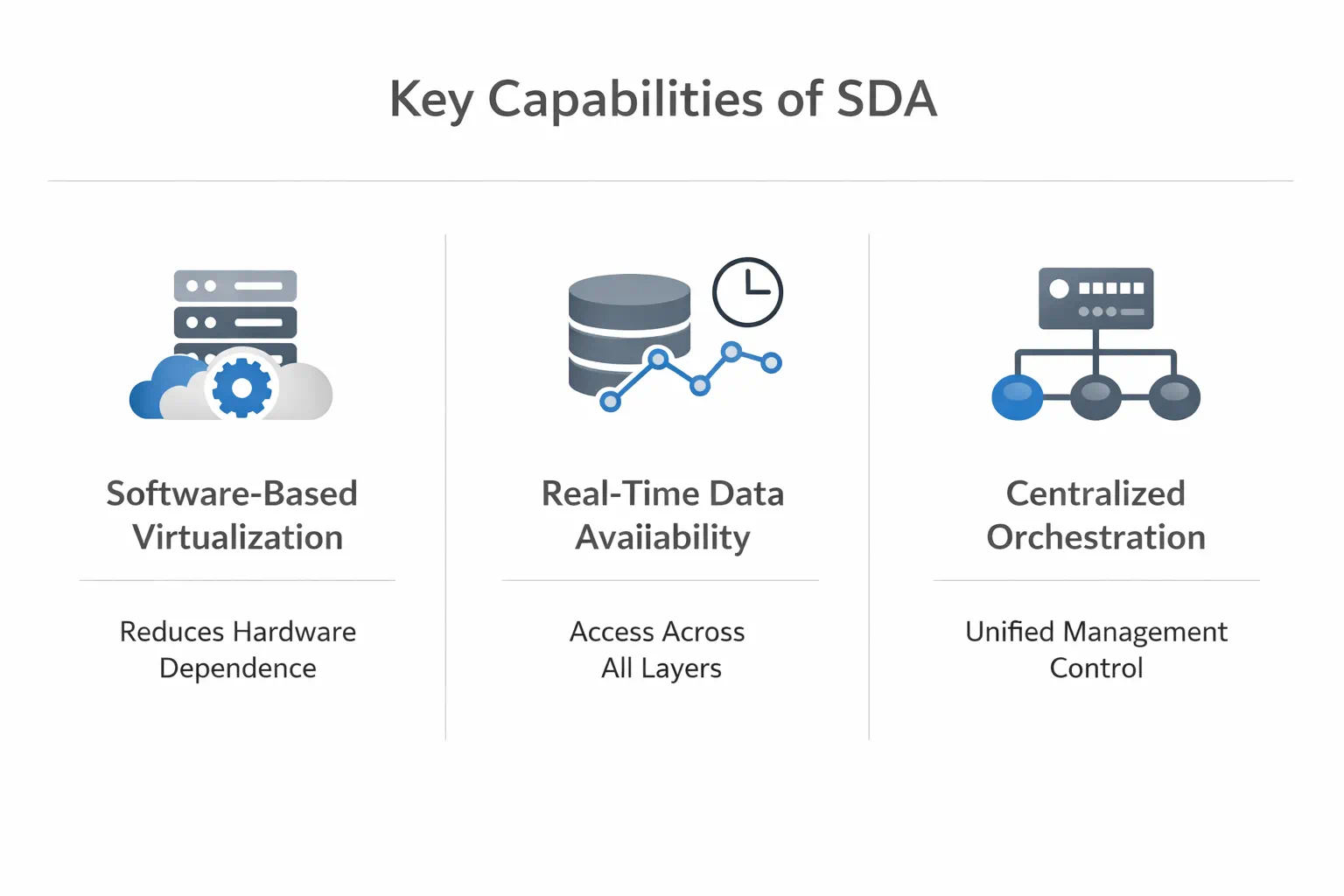 SDA rests on three core capabilities: software-based virtualization that reduces hardware dependence, real-time data availability and mobility across all layers, and centralized orchestration.